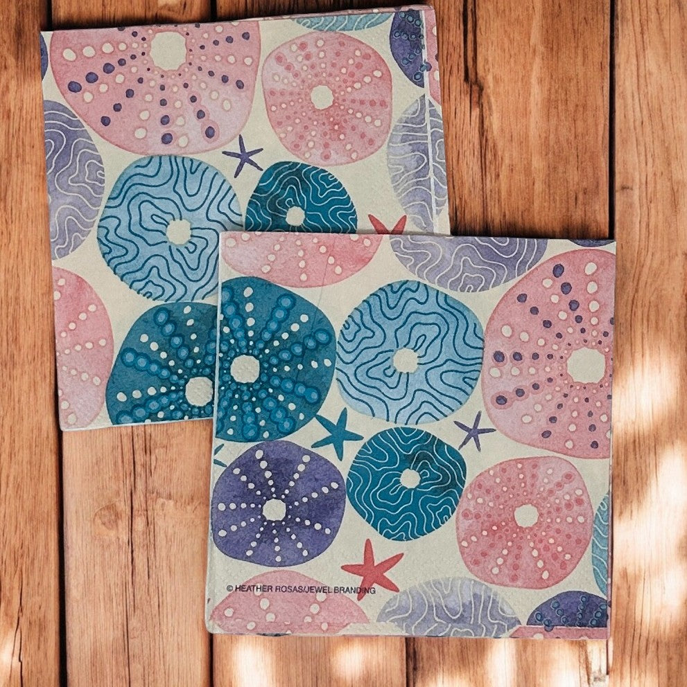 🌊 Sea Urchin Cocktail Size Decoupage Napkins – Soft Blue, Green & White on Light Beige – Coastal Ocean Napkins by Creative Converting for Crafts, Journaling & Mixed Media