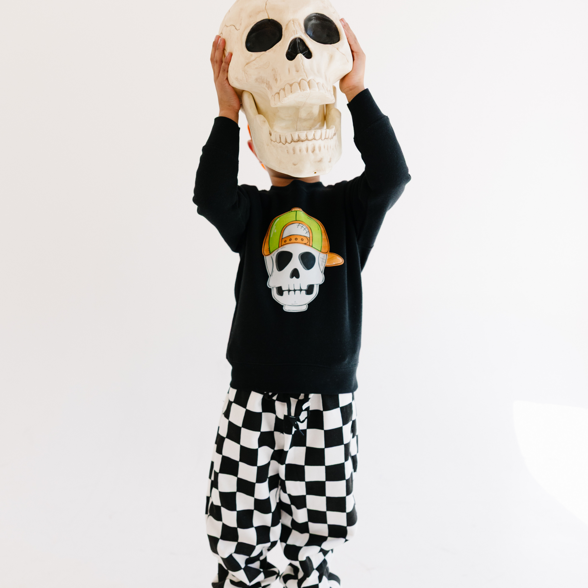 Coverstitched collar, shoulders, armholes ribbed cuffs and waistband
