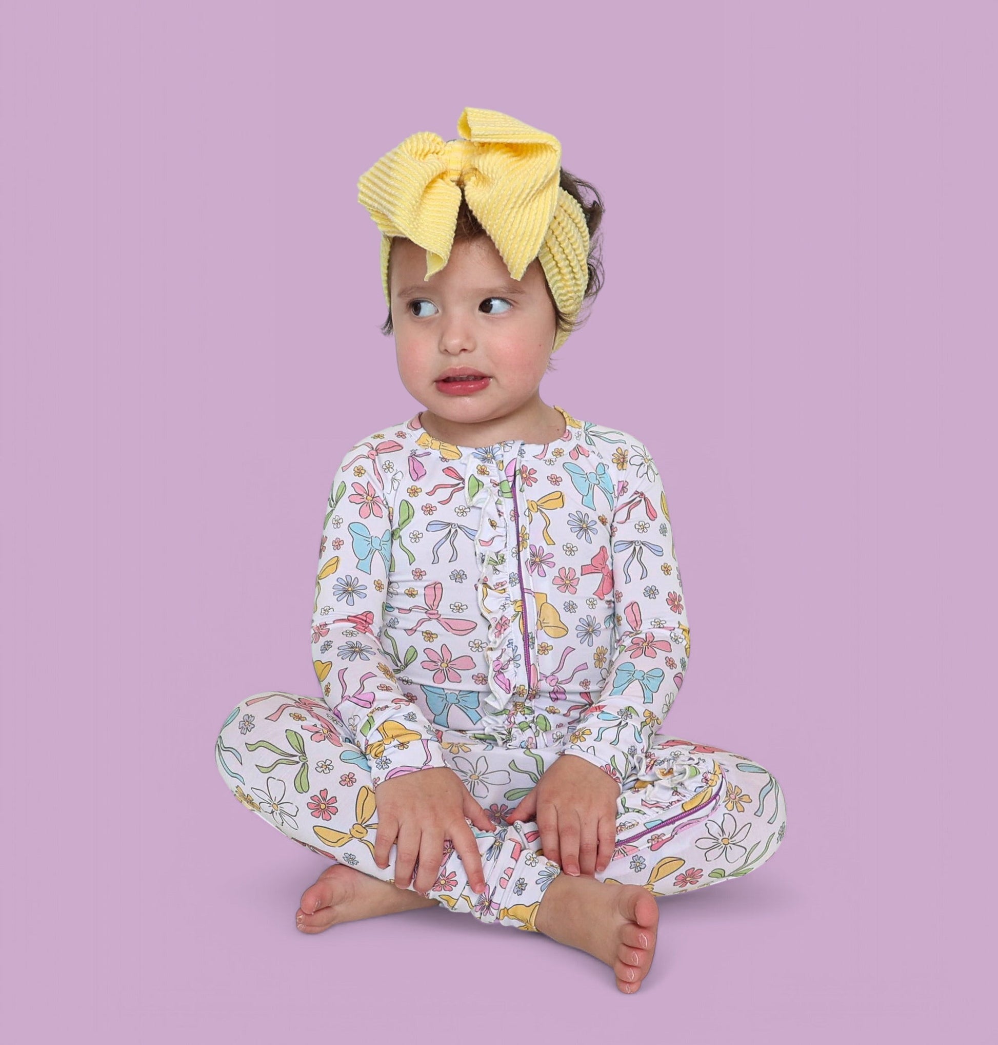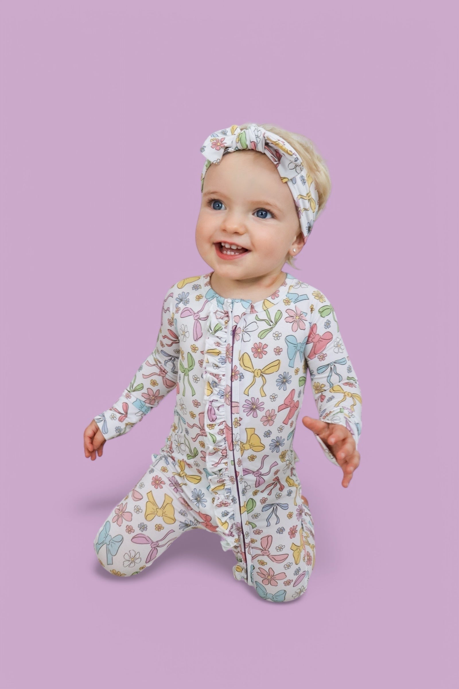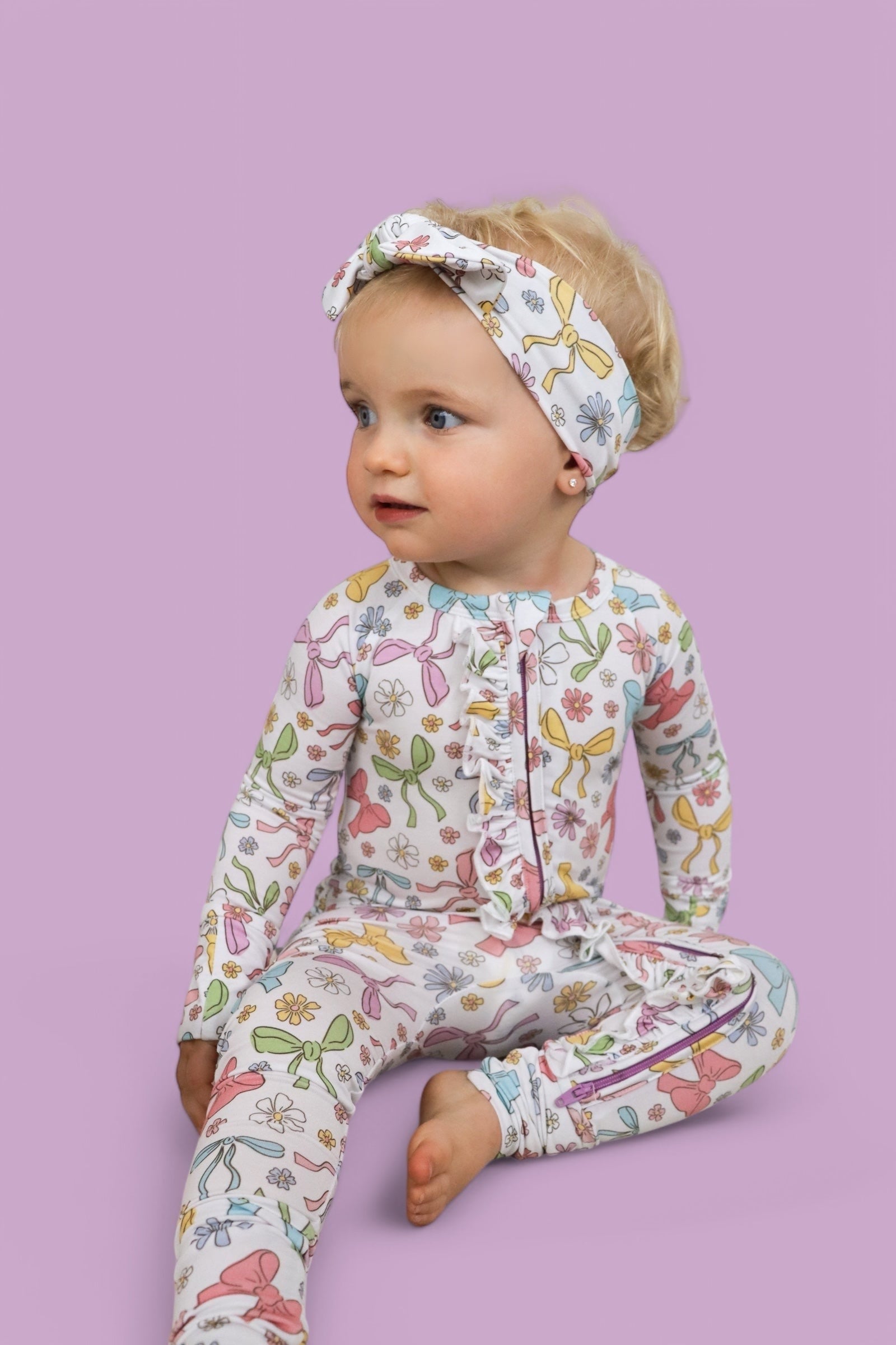 Celebrate the charm of spring with our Bow Garden Dream Ruffle Romper! Featuring a delightful garden-inspired print of blooming bows in soft, cheerful hues, this romper is perfect for your little one’s playful days and cozy nights.