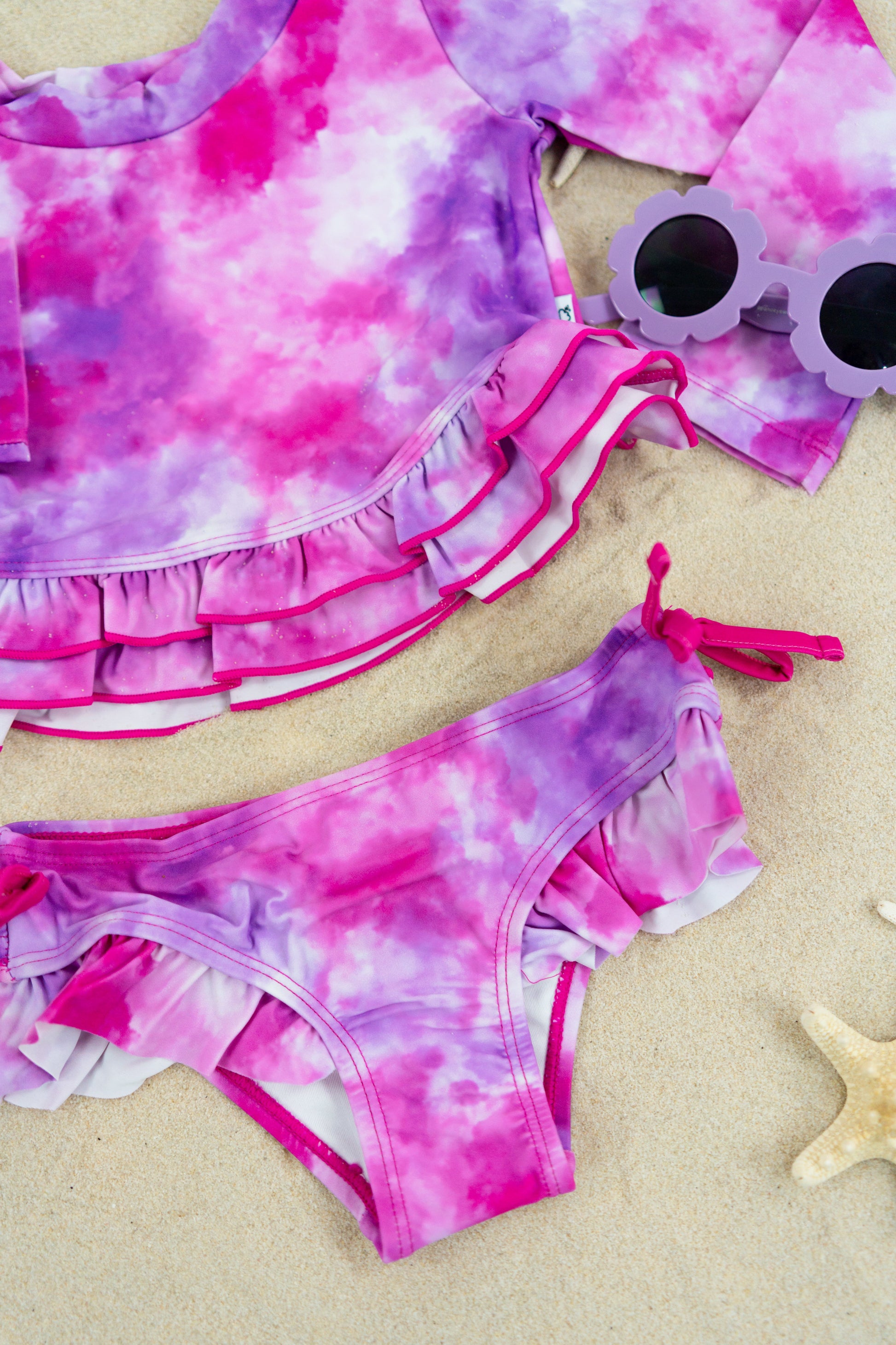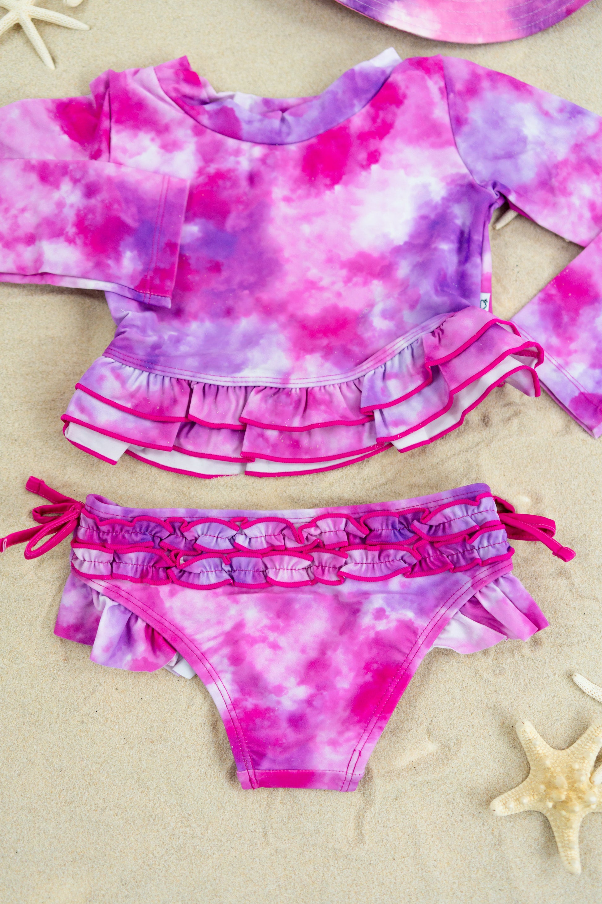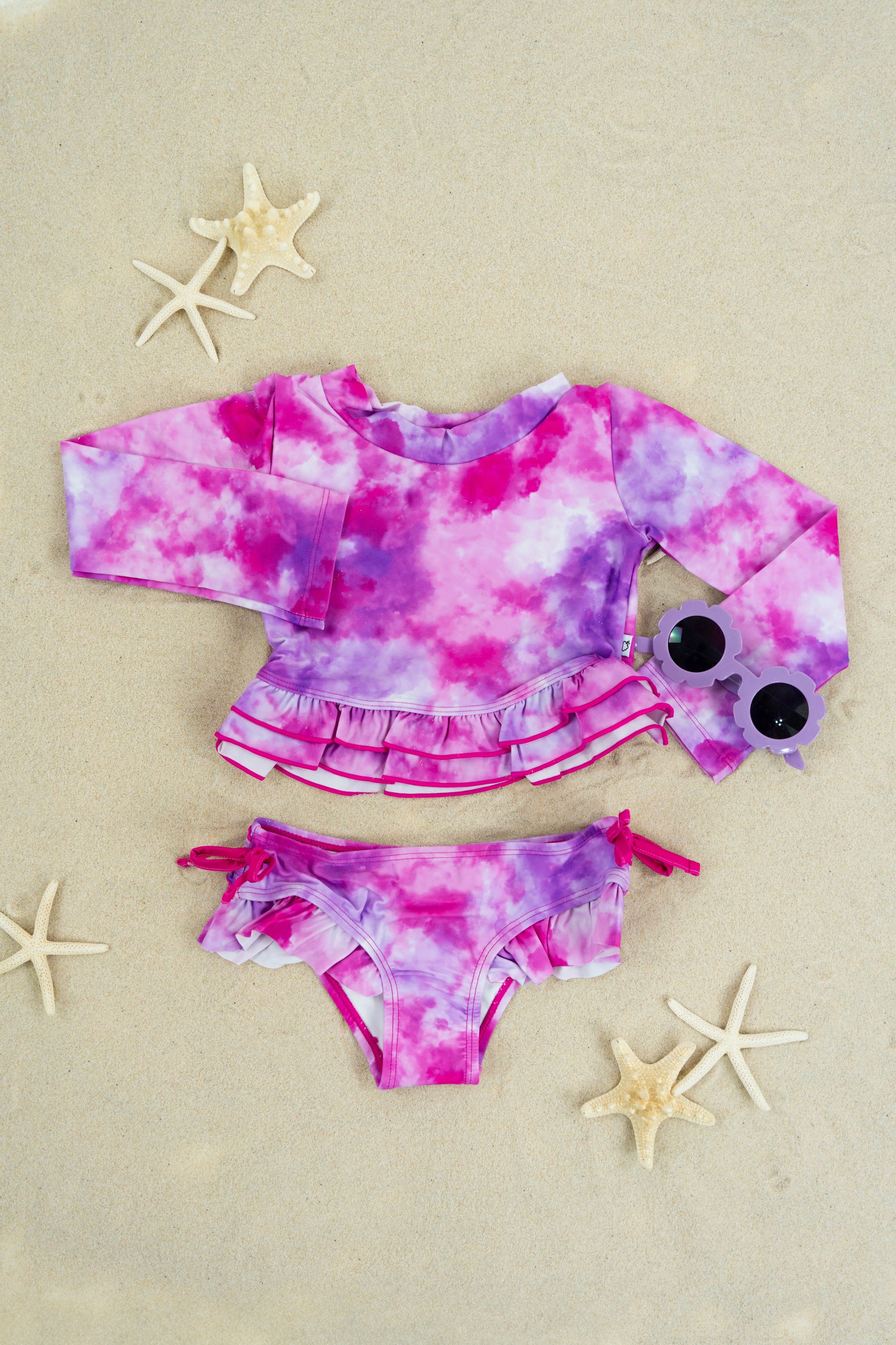 Get ready to make a splash in the Candy Clouds Dream 2-Piece Rash Guard Ruffle Swim Suit! This swimsuit is like a sweet daydream come to life, with its vibrant pinks and purples swirling in a dreamy, watercolor cloud design. The soft pastel hues are perfect for your little one to float through summer in style, whether they're building sandcastles or diving into the waves.