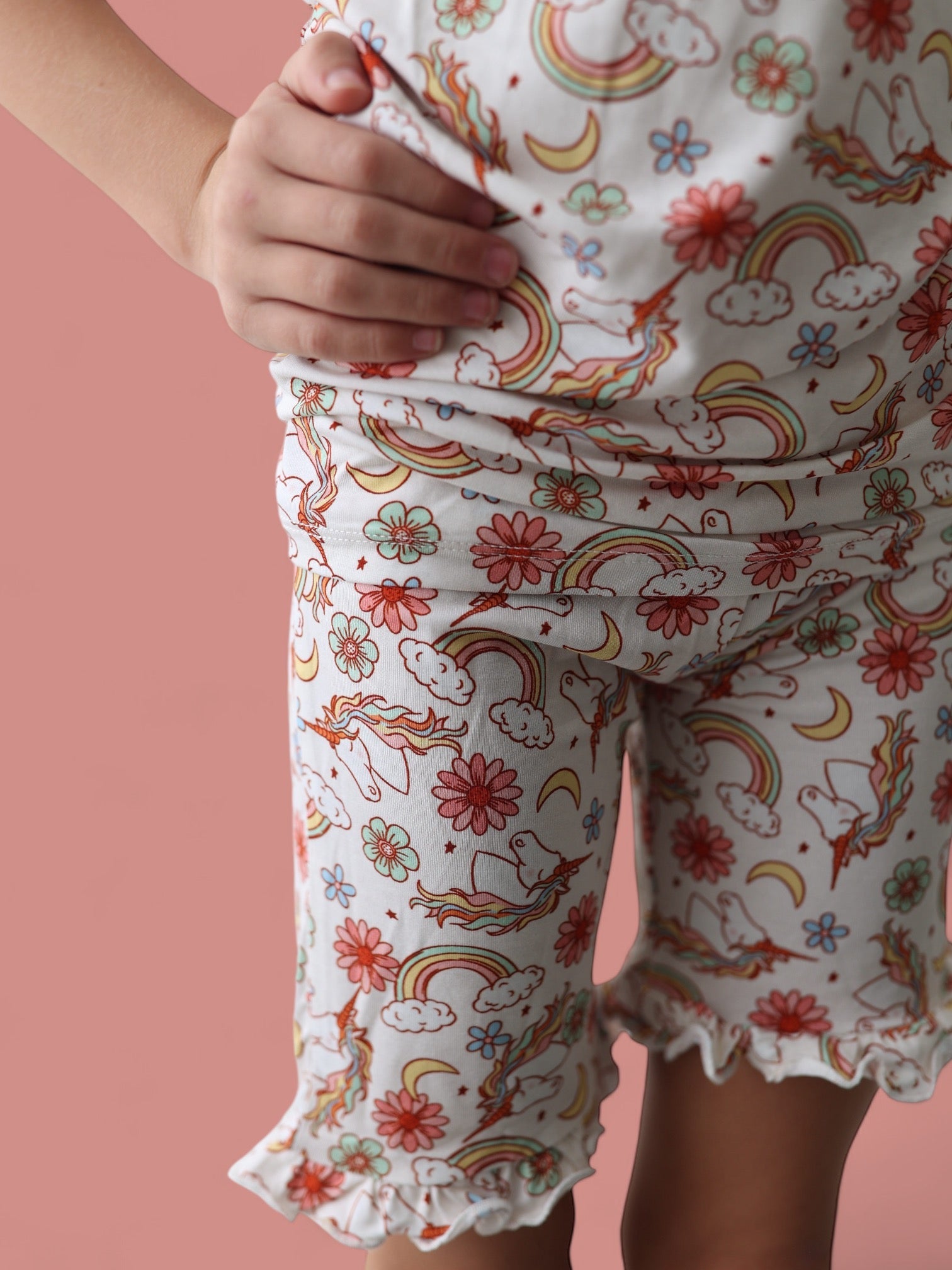 The Exclusive Enchanted Dreams Short Set is perfect for your little girl who dreams of whimsical rainbows, magical unicorns, and all things enchanting. Her face will light up with joy every time she slips into this adorable short-sleeve set, featuring the ultimate girly print that’s sure to make her feel like she’s living in a fairy tale.