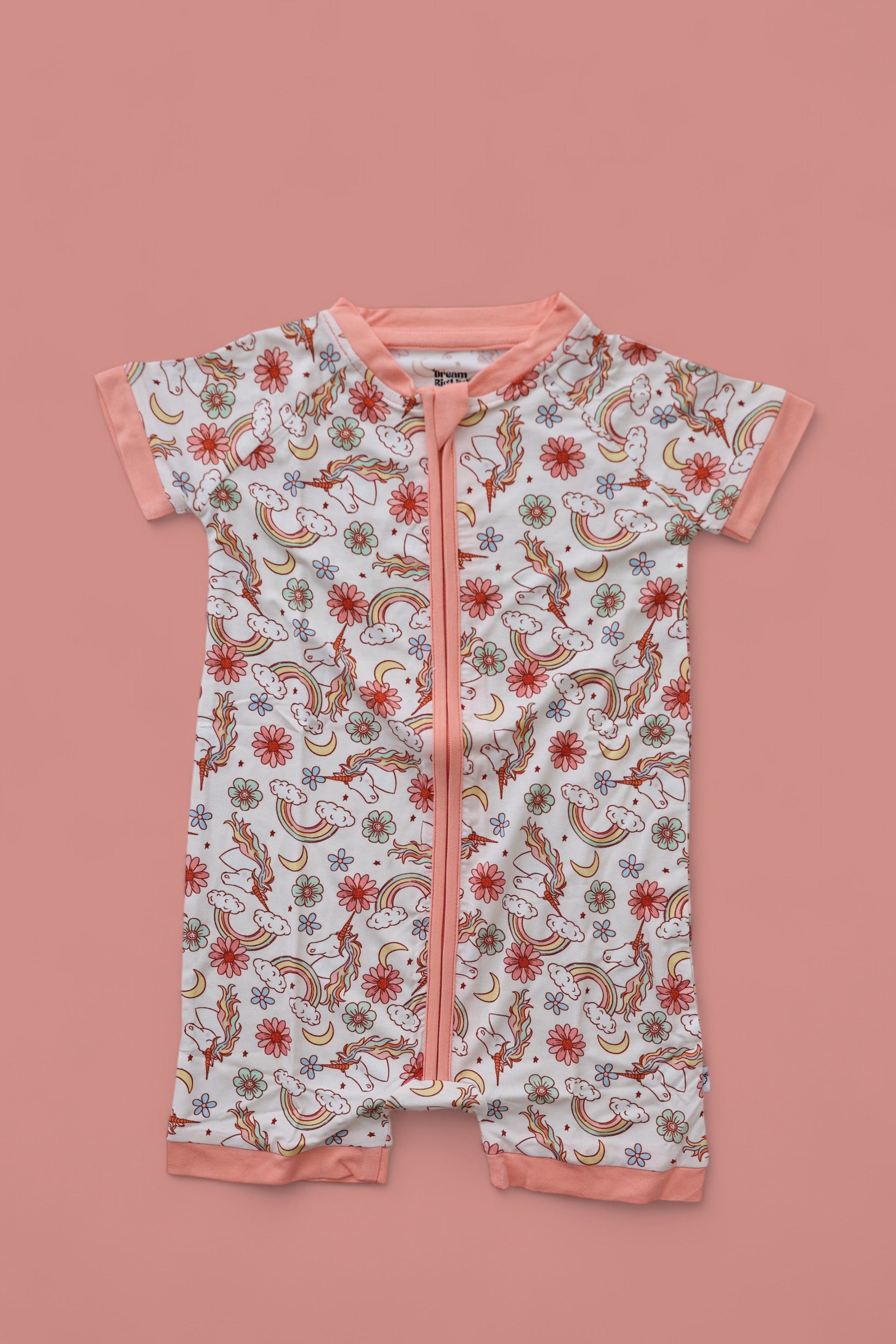 The Exclusive Enchanted Dreams Shortie is the ultimate summer essential for your little one. Filled with whimsical rainbows and magical unicorns, this adorable shortie will bring joy to her face every time she wears it. Whether she’s exploring new adventures or just living in her enchanted world, the comfort and style of this piece will make it her new favorite.
