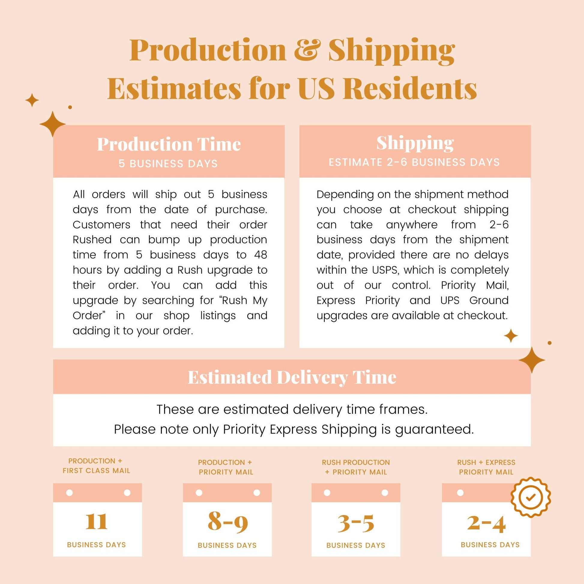 Our production time does not include shipping. Orders are shipped using USPS First Class Mail 3-5 Mail, so depending on your location they will arrive in 3-5 business days from the shipment date, provided there are no delays within the USPS, which is completely out of our control. We do offer shipment upgrades which is available at checkout. If you would like more information please message us with your zip code and we will be happy to provide you with a price quote.