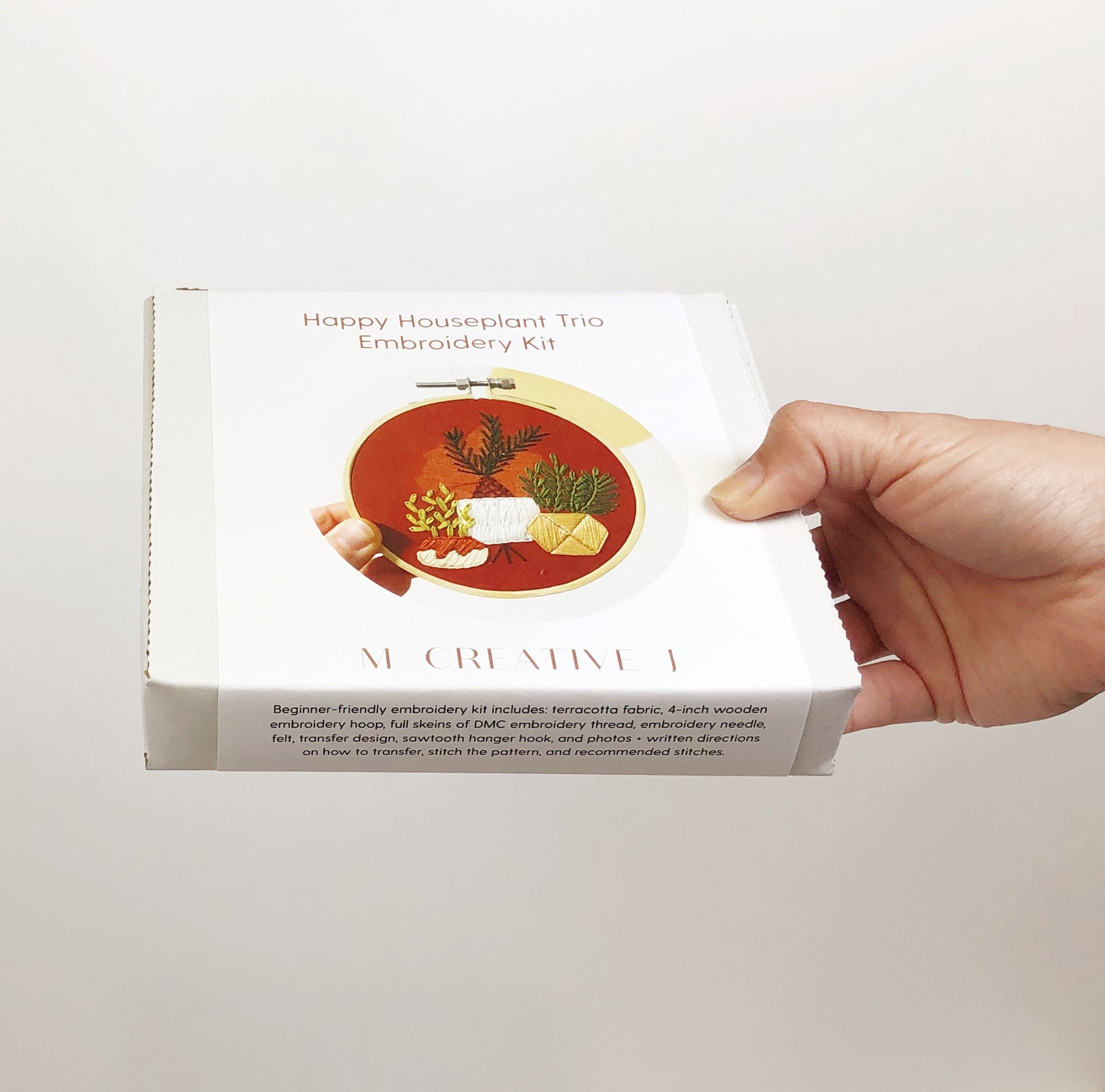 Inspired by plants I love and plants, I wish I owned, this happy houseplant trio embroidery pattern is a great way to create your own greenery. This embroidery kit makes learning hand embroidery easy with detailed photo and written instructions. From how to split thread and place fabric in the hoop to how to create each stitch and step in the pattern, you'll have these houseplants embroidered in no time! This kit includes: rust colored fabric, a transfer pattern, a wooden 4 inch embroidery hoop, embroidery needle, full skeins of DMC embroidery thread, backing materials, and printed instructions.