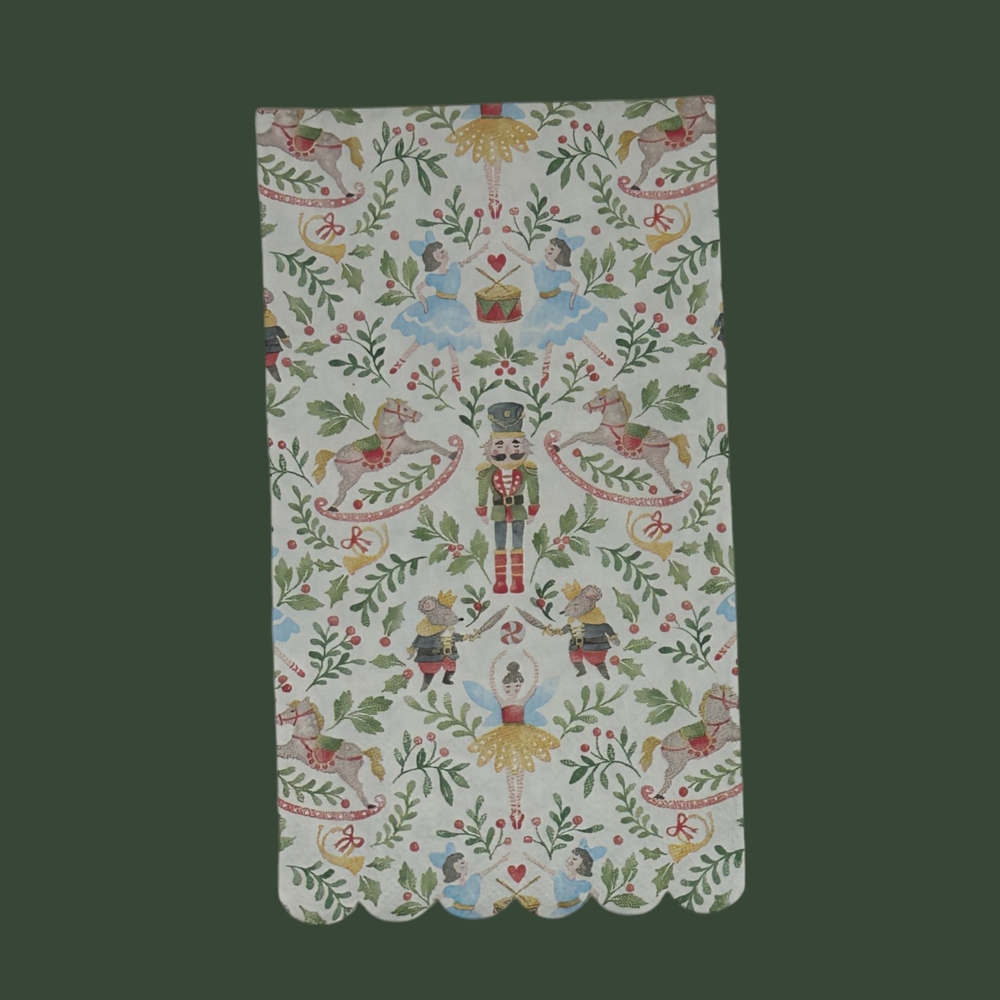 Bring the magic of the holiday season to your creative projects with these Nutcracker guest-size decoupage napkins. Featuring a whimsical design of nutcrackers, ballerinas, rocking horses, and festive greenery, these napkins capture the timeless charm of the classic Christmas ballet. Perfect for adding festive flair to holiday décor, Christmas parties, or seasonal craft projects, they are a must-have for your holiday craft stash.