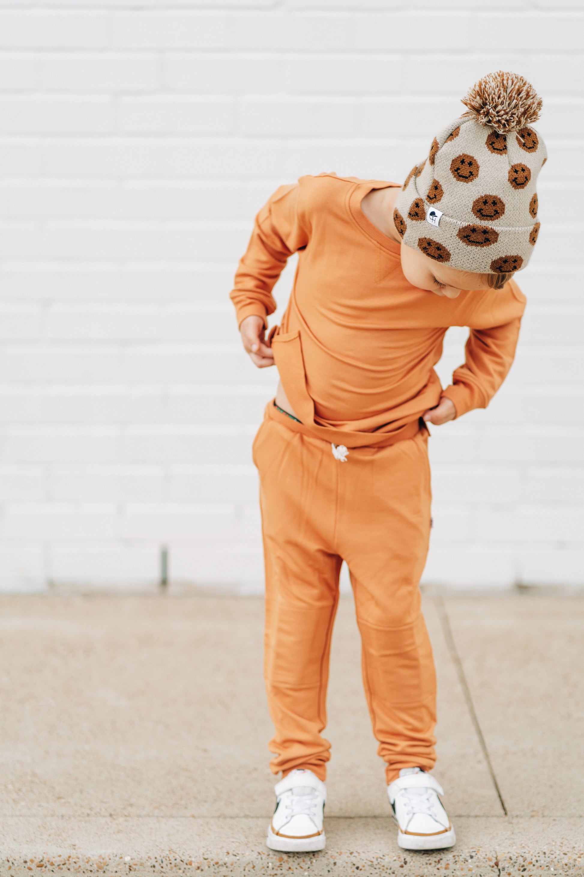 Let your kids show off their autumn style with these Pumpkin Dream Joggers! Perfect for cold weather, these comfy joggers are made of bamboo material and feature a fun pumpkin color, making them a must-have for your family's seasonal wardrobe. Who knew pumpkin could be so stylish?!