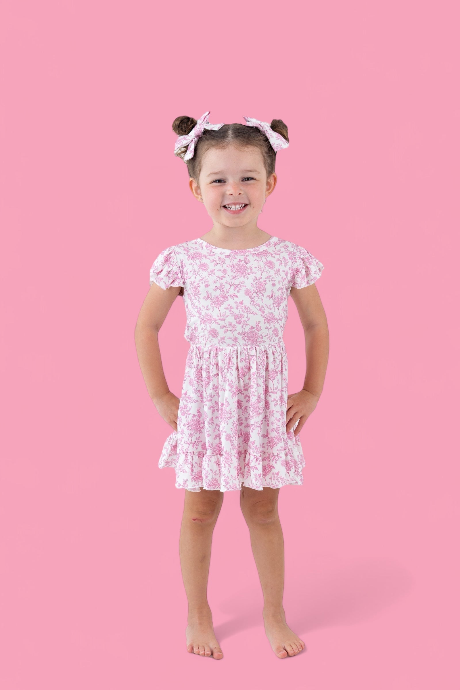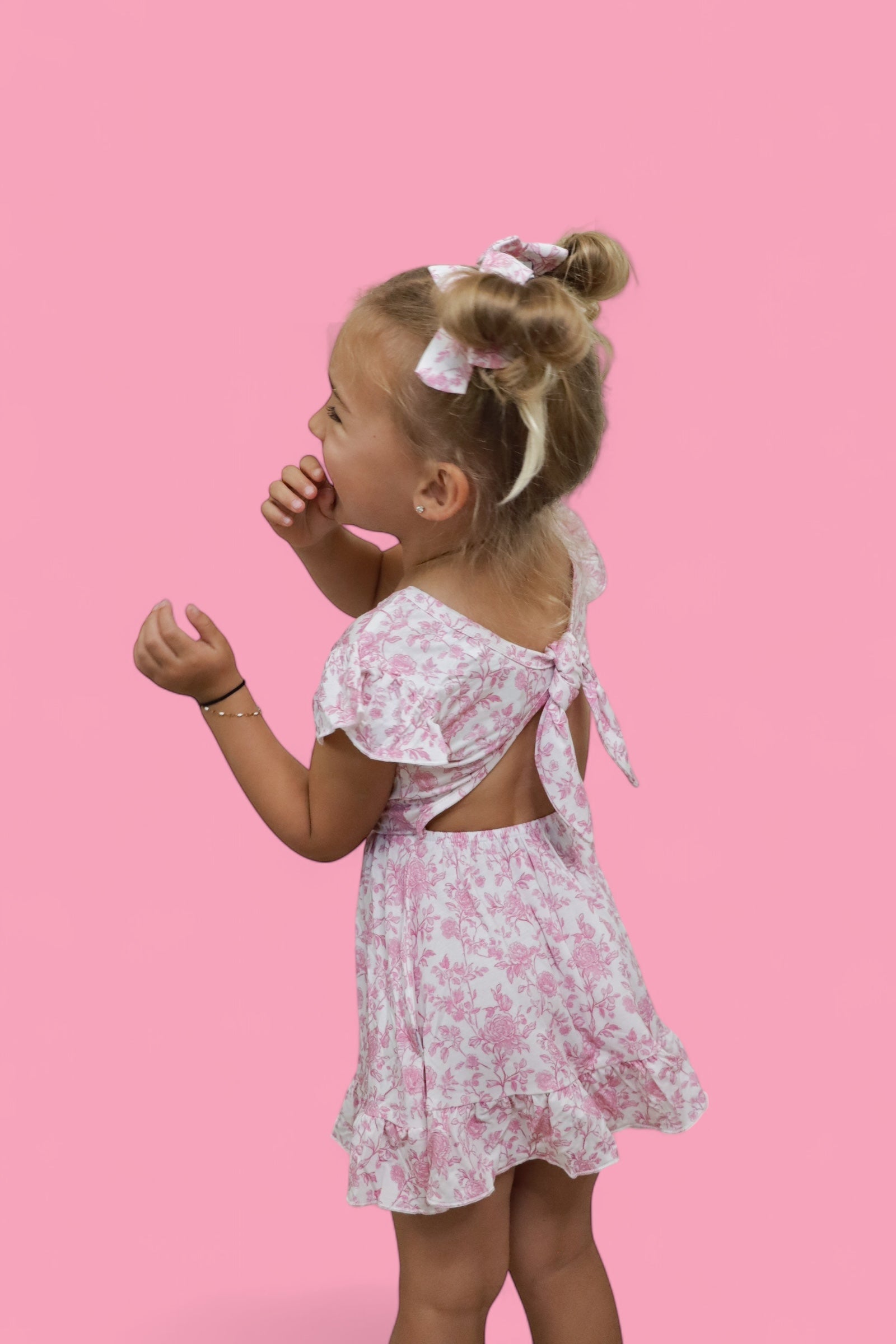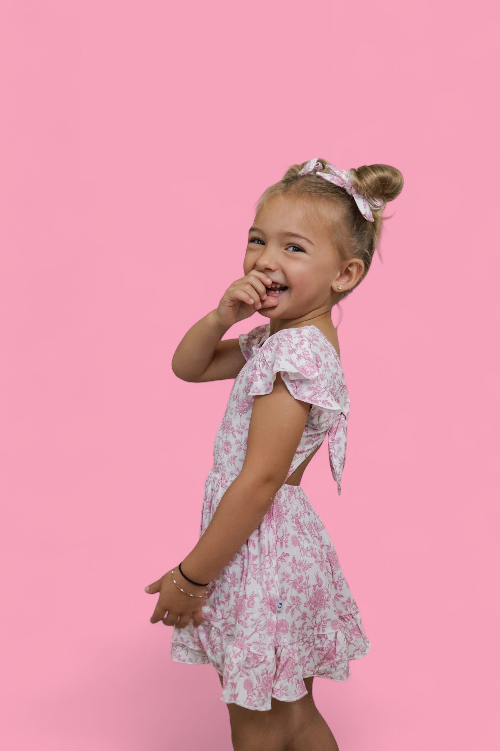Let the twirling begin! Our Rosewood Toile Dream Tie Back Ruffle Dress is the perfect blend of charm, comfort, and classic style. Featuring a vintage-inspired rosewood floral toile print and sweet ruffle accents, this dress is designed to shine at every playdate, party, or photo-worthy moment.
