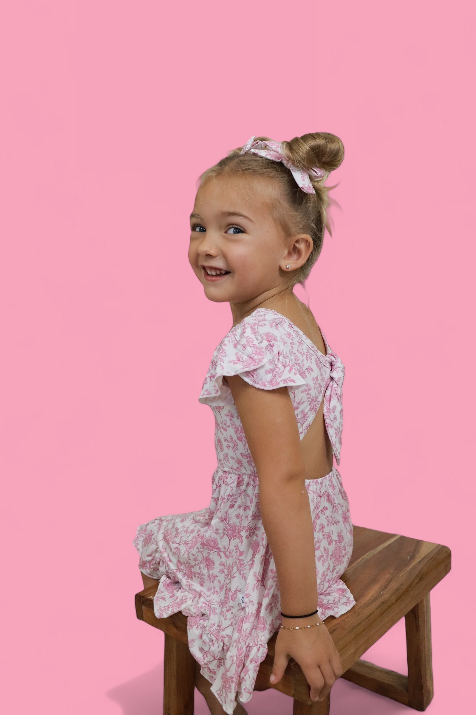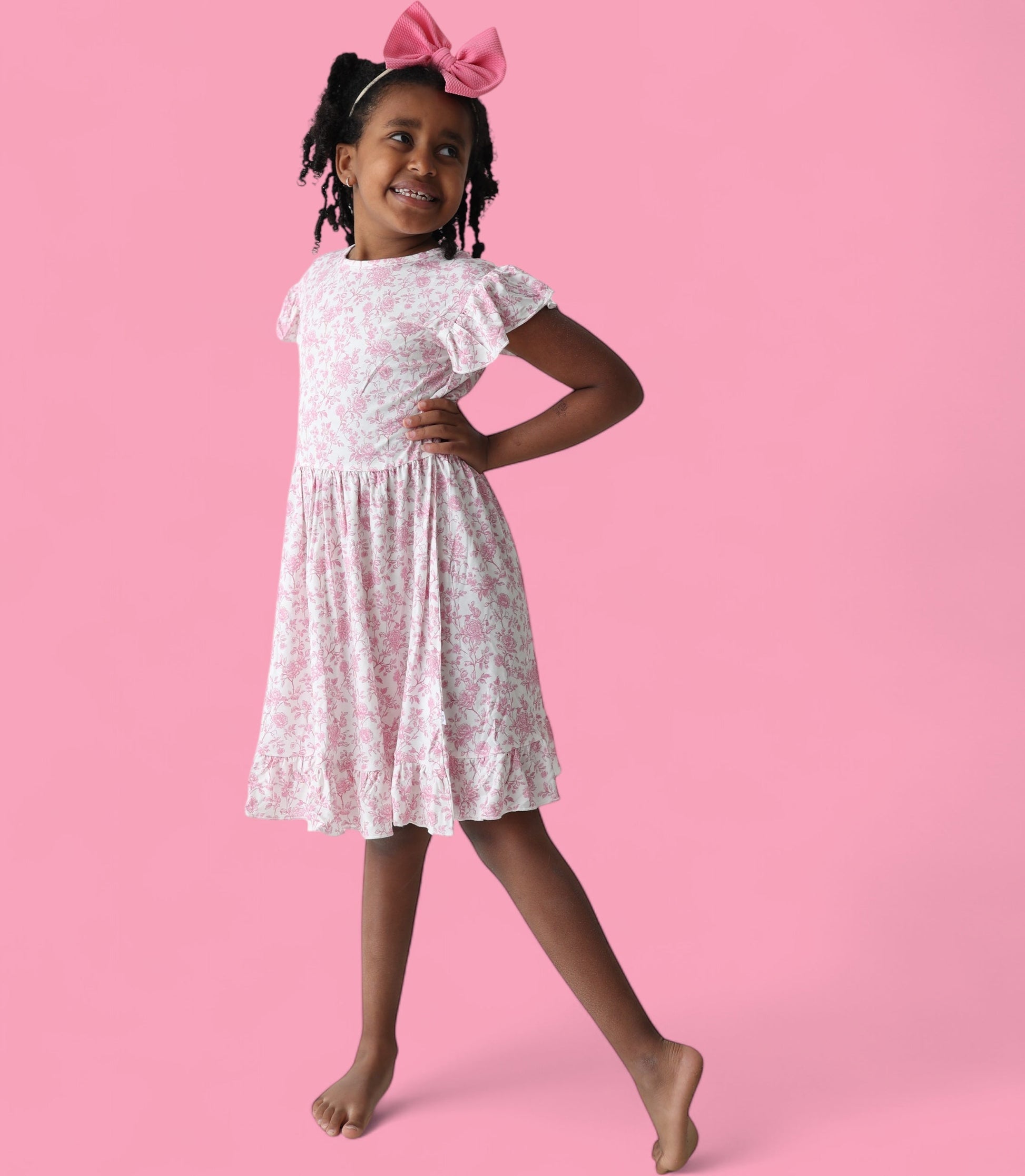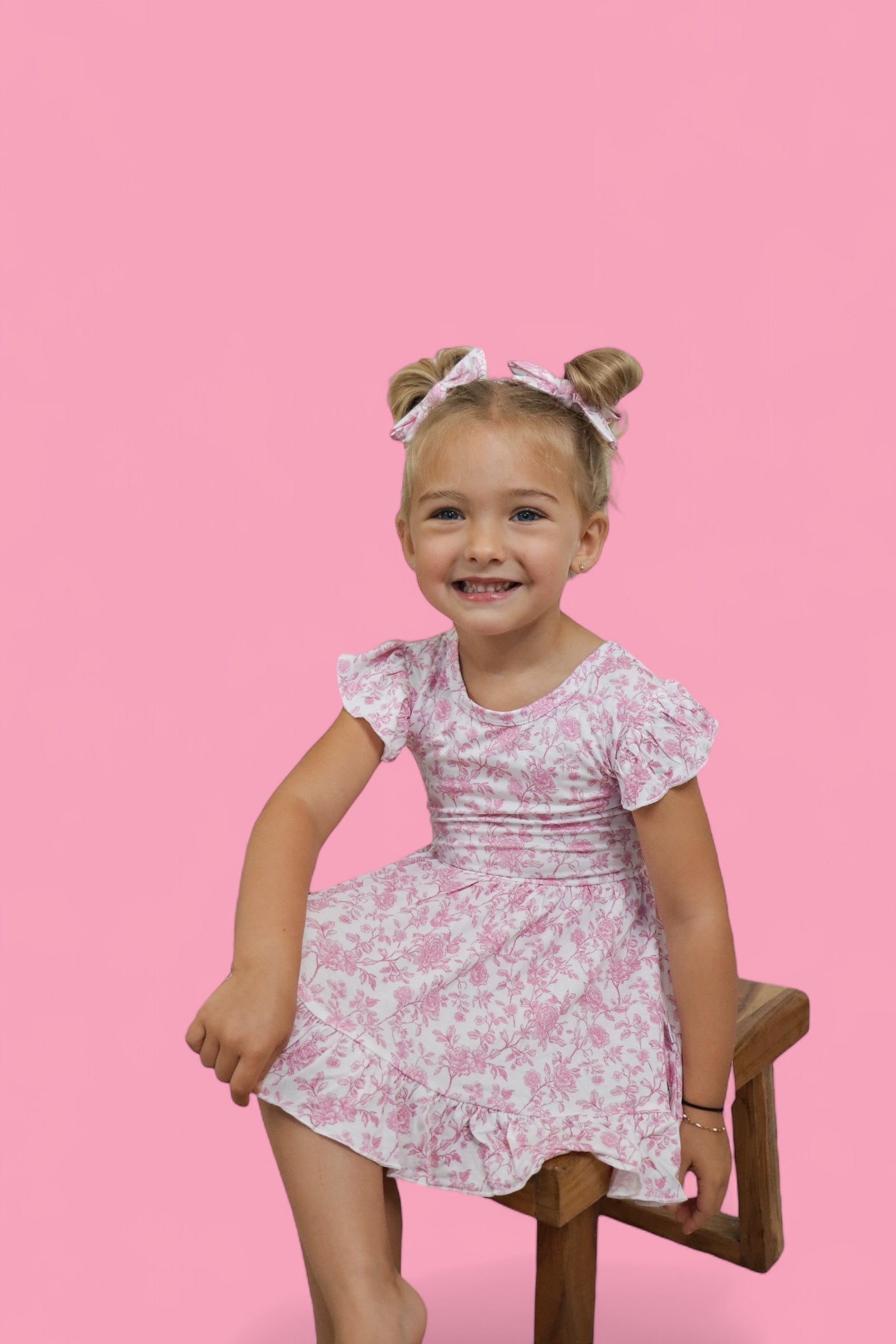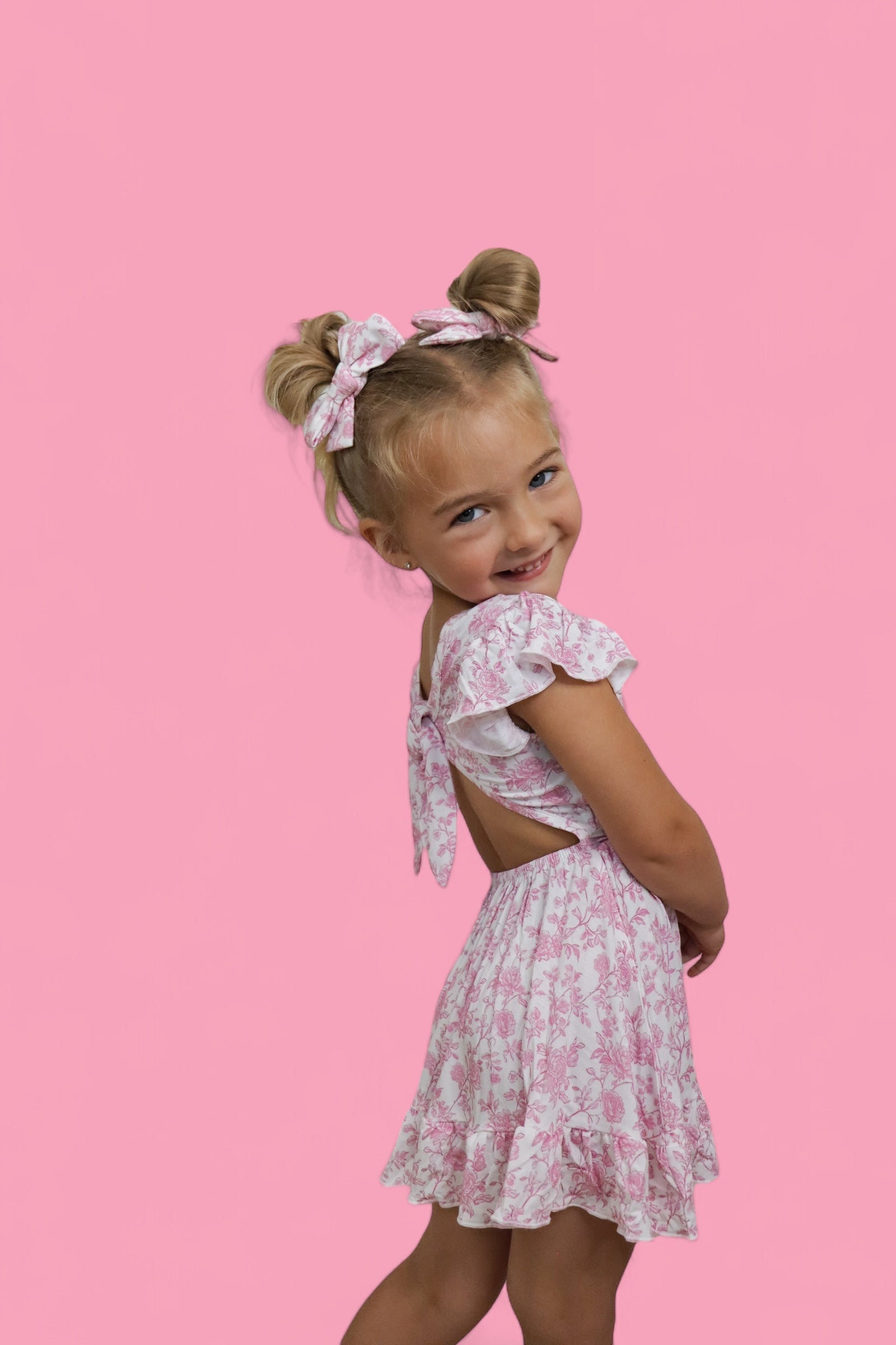 Let the twirling begin! Our Rosewood Toile Dream Tie Back Ruffle Dress is the perfect blend of charm, comfort, and classic style. Featuring a vintage-inspired rosewood floral toile print and sweet ruffle accents, this dress is designed to shine at every playdate, party, or photo-worthy moment.