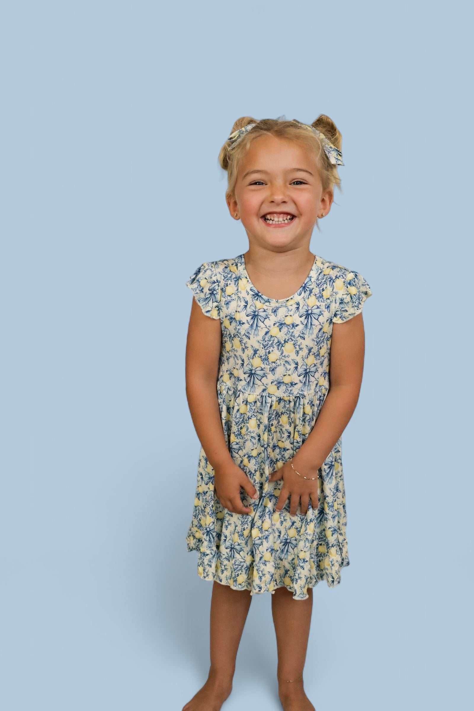 Designed with delicate cap sleeves and ruffle details that flutter with every spin, this dress is made for movement and fun. Crafted from buttery-soft, breathable bamboo viscose, it keeps your little one cool, comfy, and stylish all day long—whether they’re dancing in the living room or snoozing after a big day of play.
