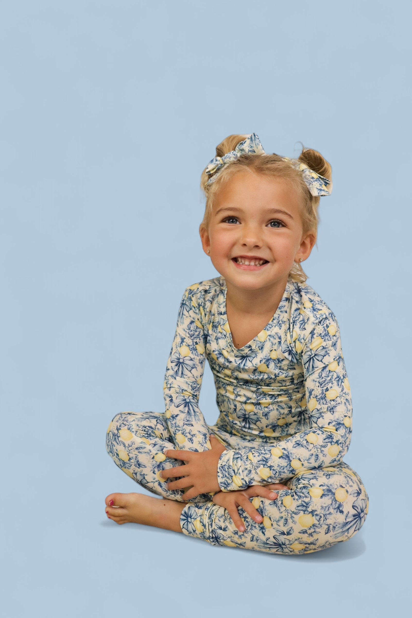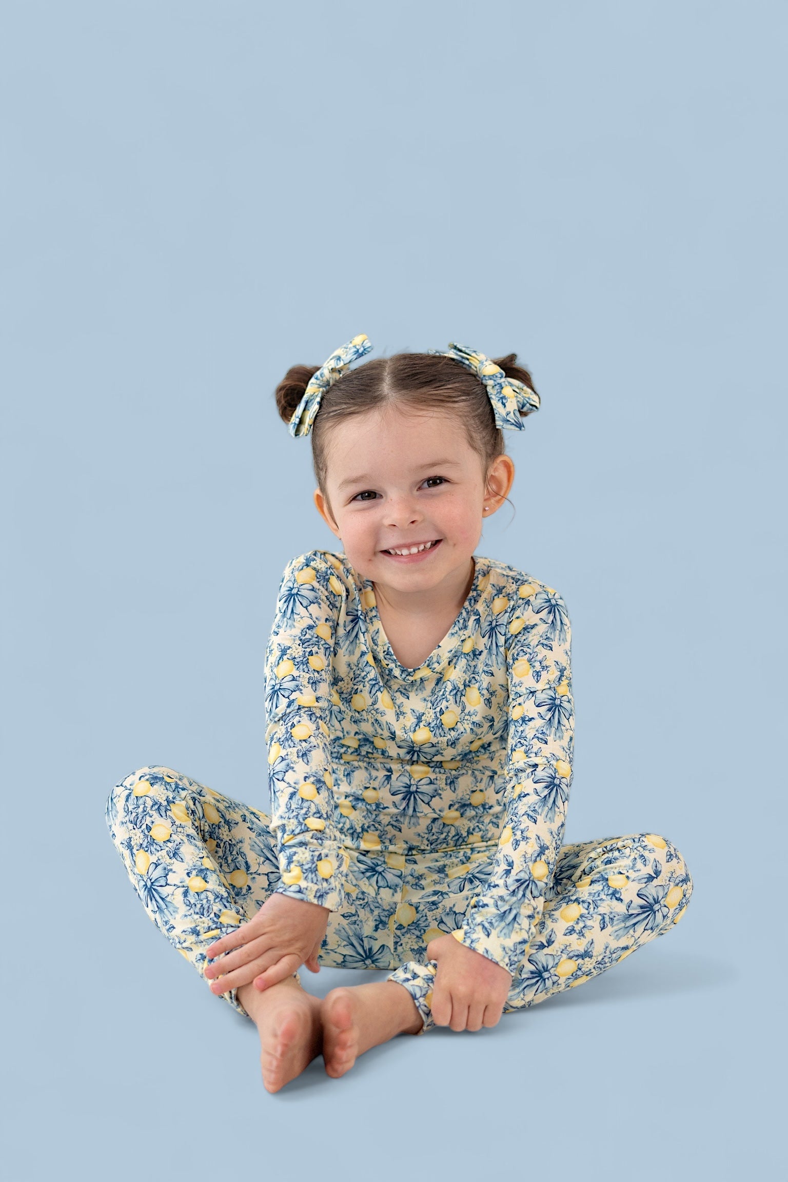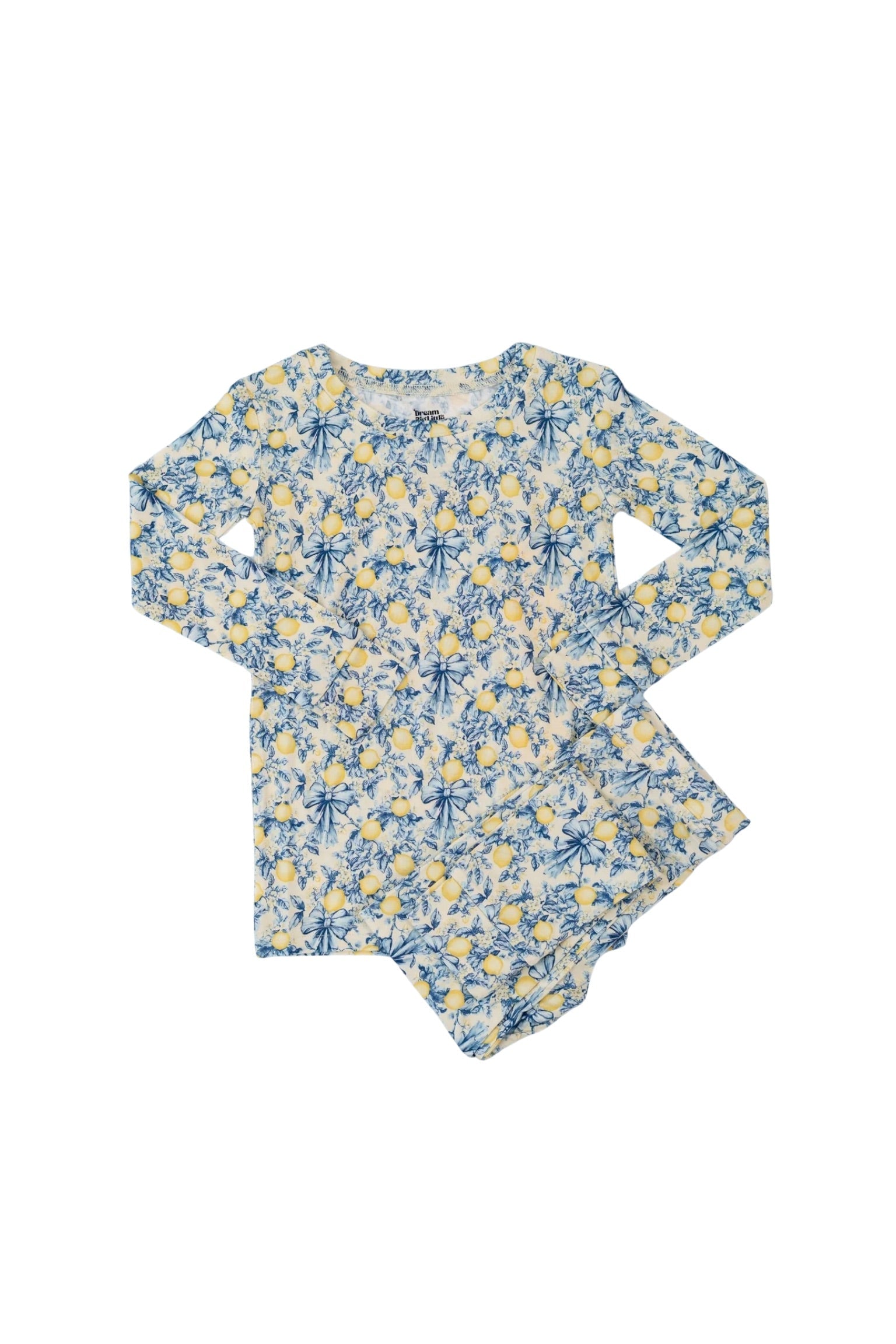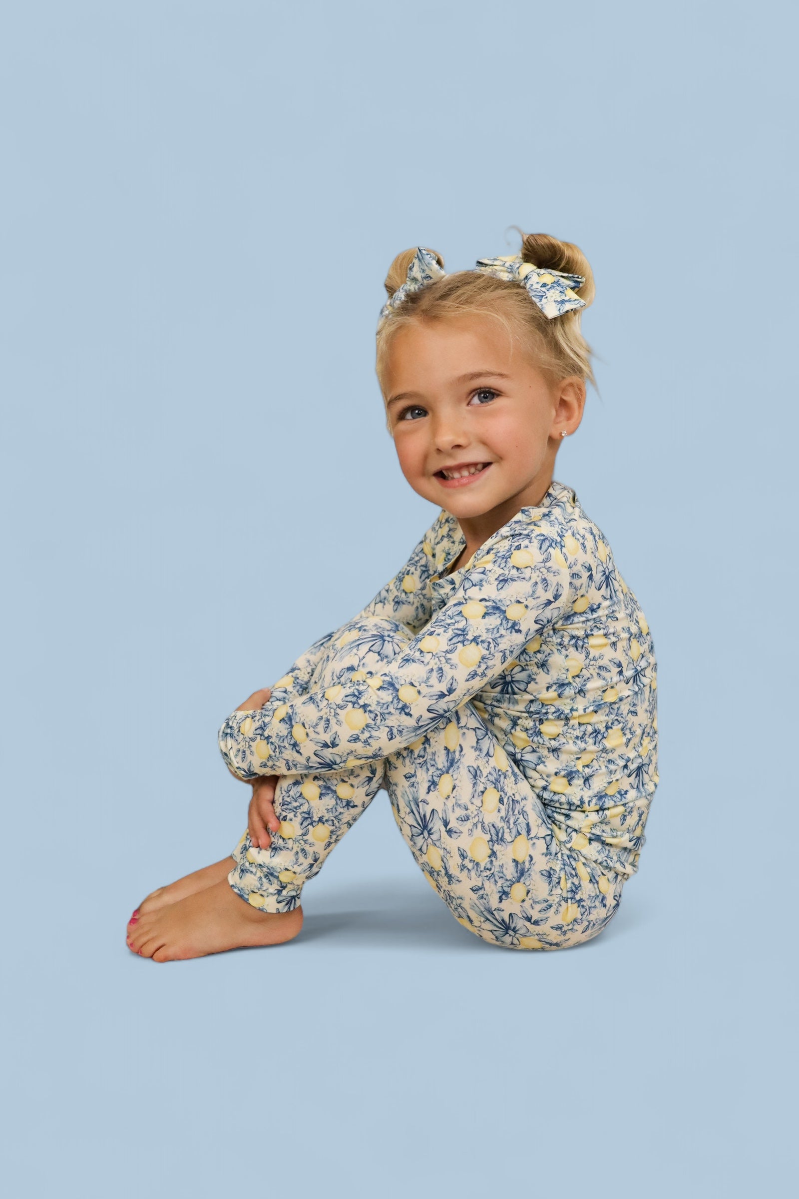 Step into a world of timeless elegance with the Vintage Citrus Toile Ruffle Dream Set. Inspired by the refined charm of French countryside textiles, this exquisite pajama set features a delicate toile-style pattern adorned with hand-sketched blue florals, graceful bows, and sun-kissed golden lemons. A true nod to vintage sophistication, this print evokes the beauty of heirloom linens and sunlit orchard strolls.