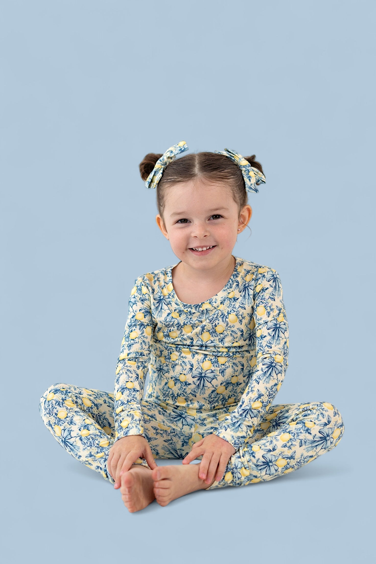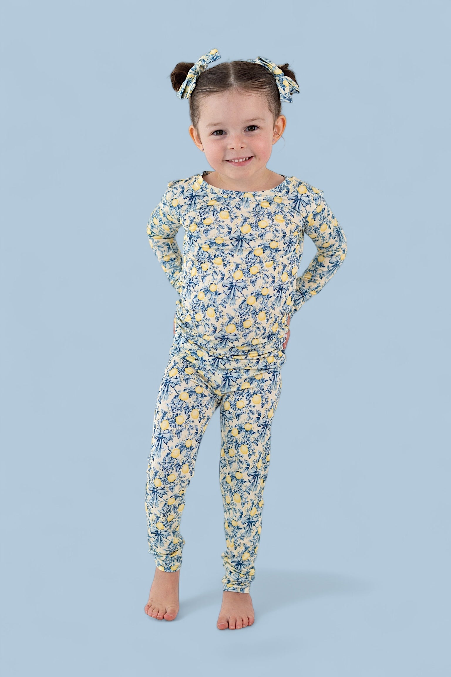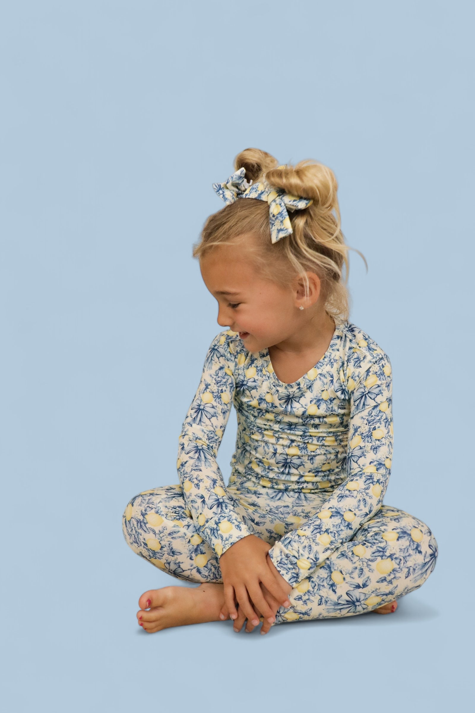 Step into a world of timeless elegance with the Vintage Citrus Toile Ruffle Dream Set. Inspired by the refined charm of French countryside textiles, this exquisite pajama set features a delicate toile-style pattern adorned with hand-sketched blue florals, graceful bows, and sun-kissed golden lemons. A true nod to vintage sophistication, this print evokes the beauty of heirloom linens and sunlit orchard strolls.