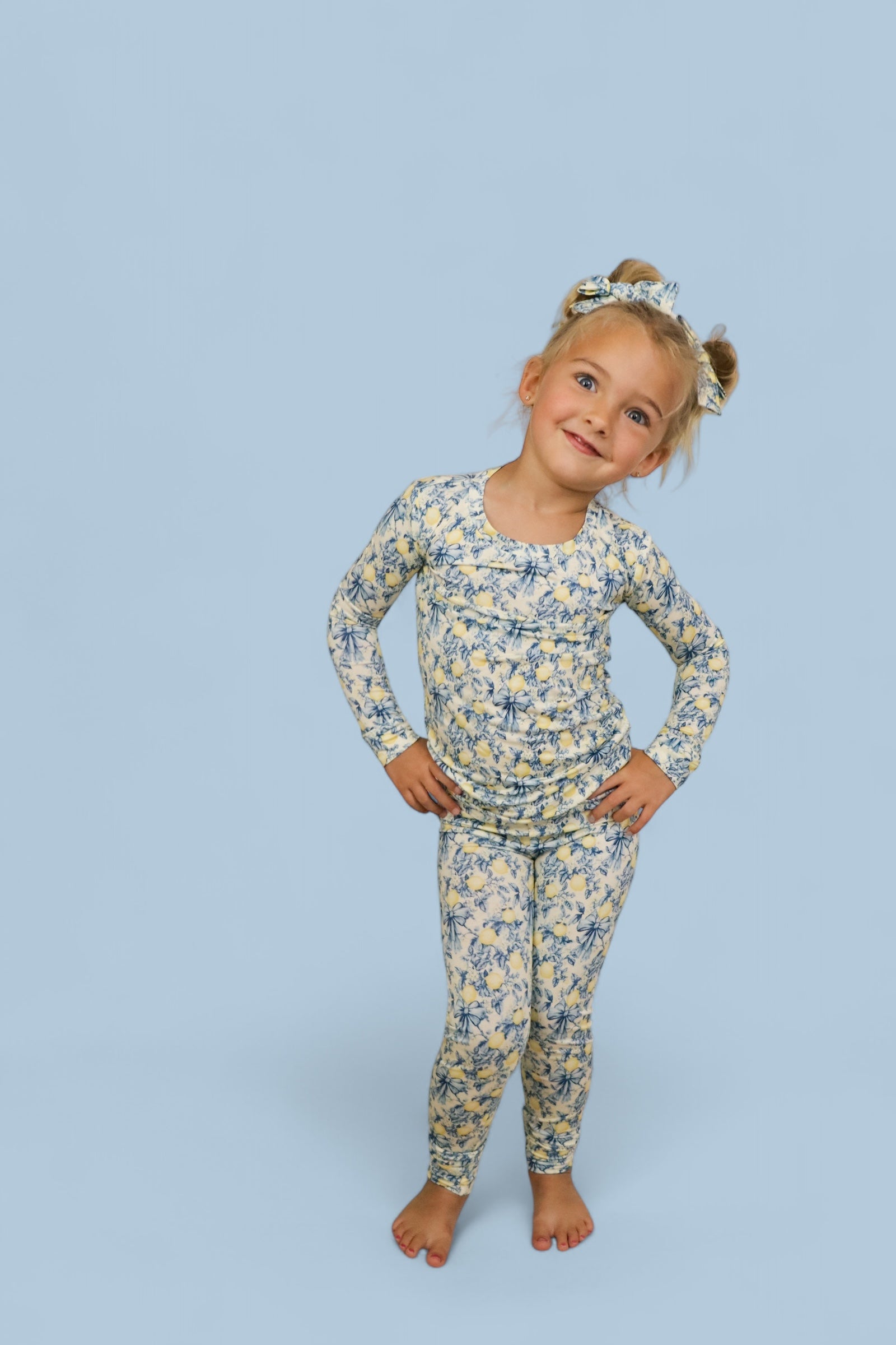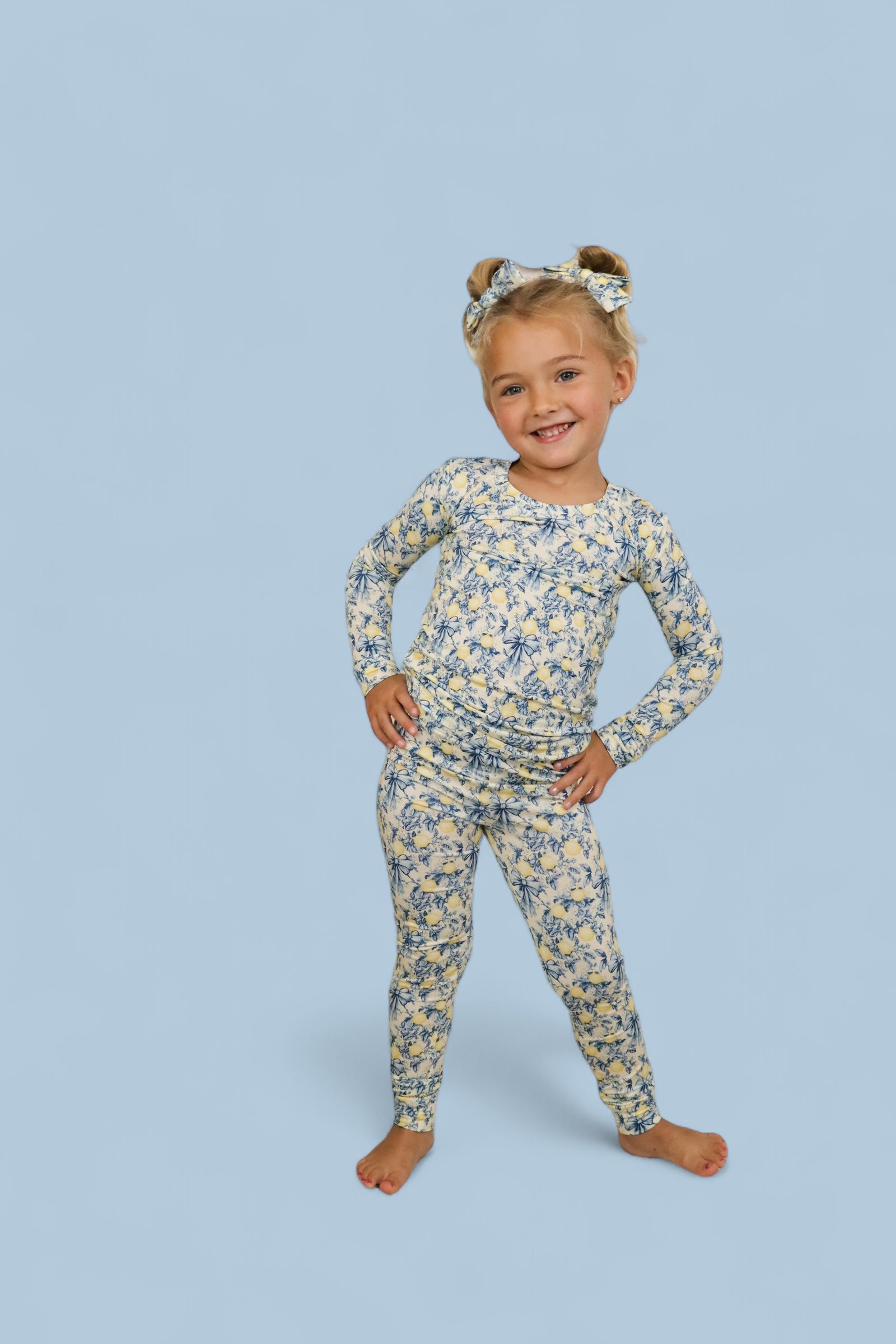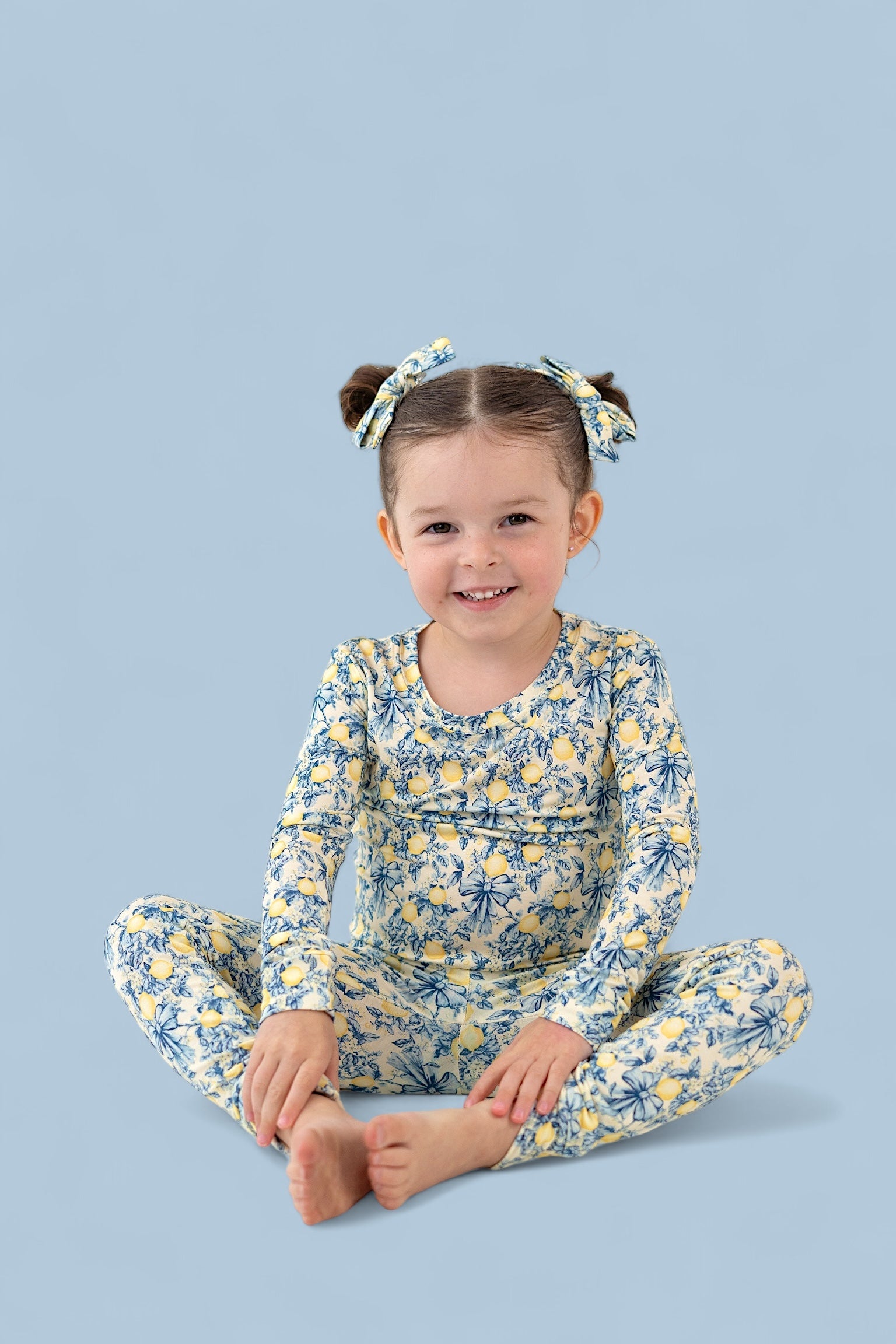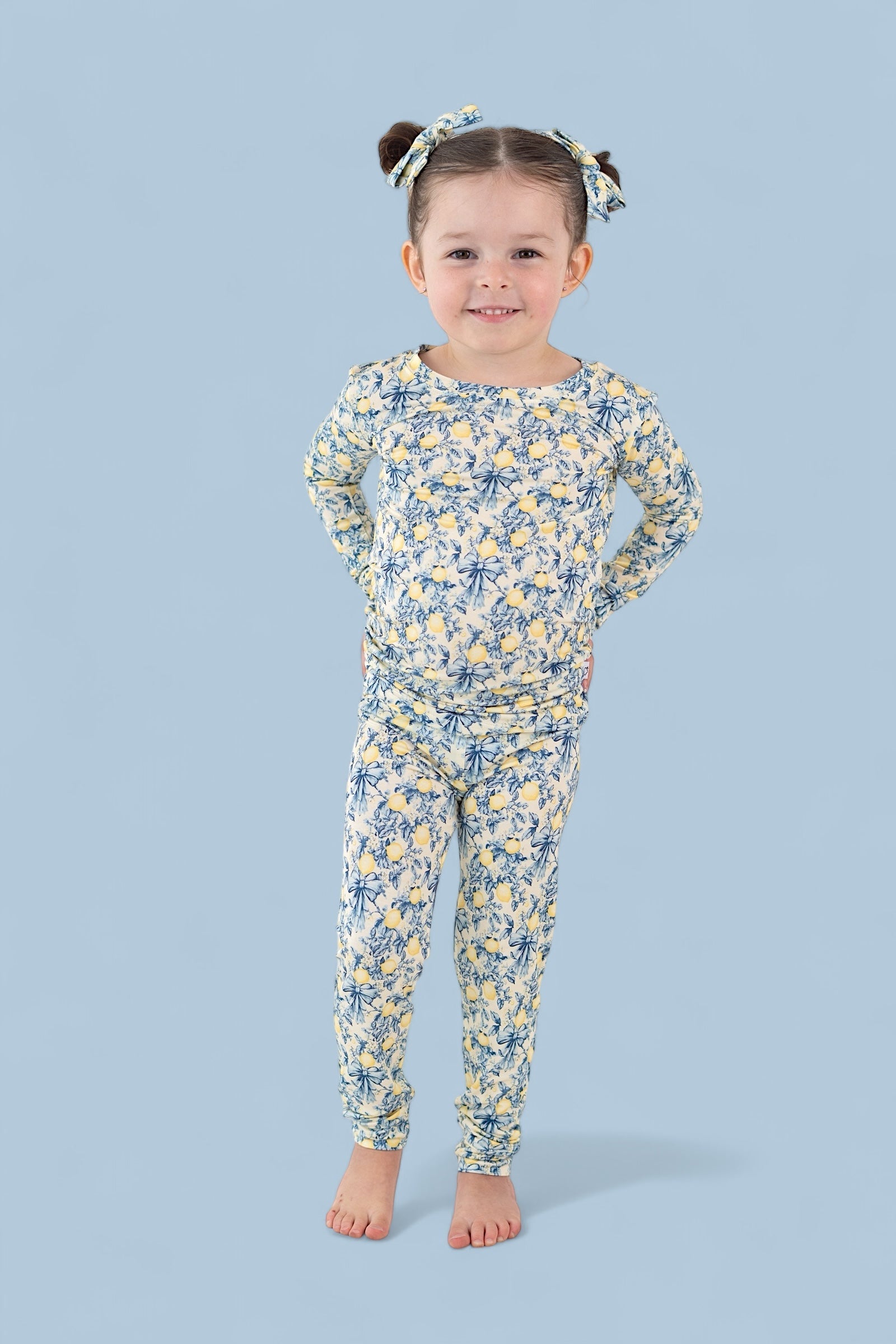Step into a world of timeless elegance with the Vintage Citrus Toile Ruffle Dream Set. Inspired by the refined charm of French countryside textiles, this exquisite pajama set features a delicate toile-style pattern adorned with hand-sketched blue florals, graceful bows, and sun-kissed golden lemons. A true nod to vintage sophistication, this print evokes the beauty of heirloom linens and sunlit orchard strolls.