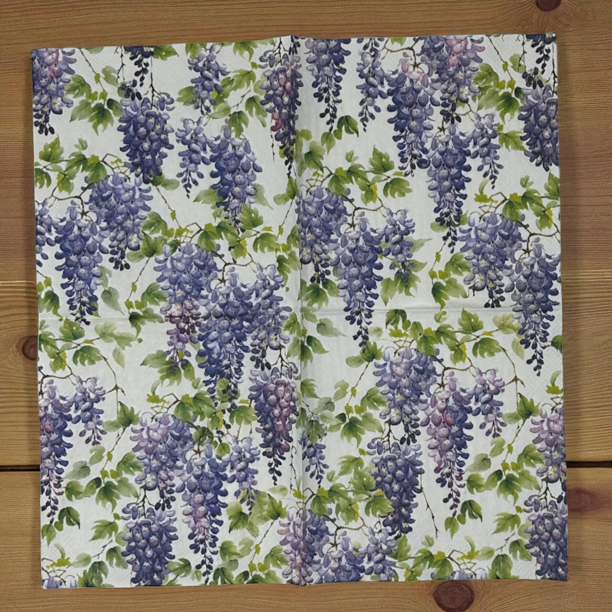 Bring timeless floral elegance to your crafts with these beautiful wisteria decoupage napkins. Featuring cascading purple wisteria blooms with lush green leaves on a soft background, these cocktail-size napkins add a romantic, garden-inspired touch to any creative project.